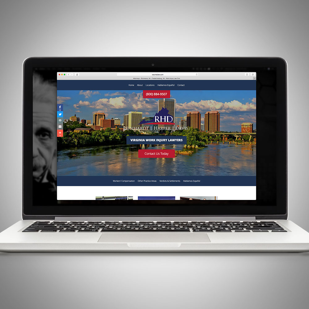 The new site of Reinhardt, Harper, Davis PLC, uses the Vertex theme, one of our very first Thesis themes designed specifically for mobile, but with the ability to provide an uncompromised user experience on desktop machines as well. It presents mobile users with an ultra-clean design that wastes no time in introducing their primary practice areas. Next, it segues into a concise, easy-to-read introduction to their practice, which handles a large volume of personal injury and workers’ compensation cases.